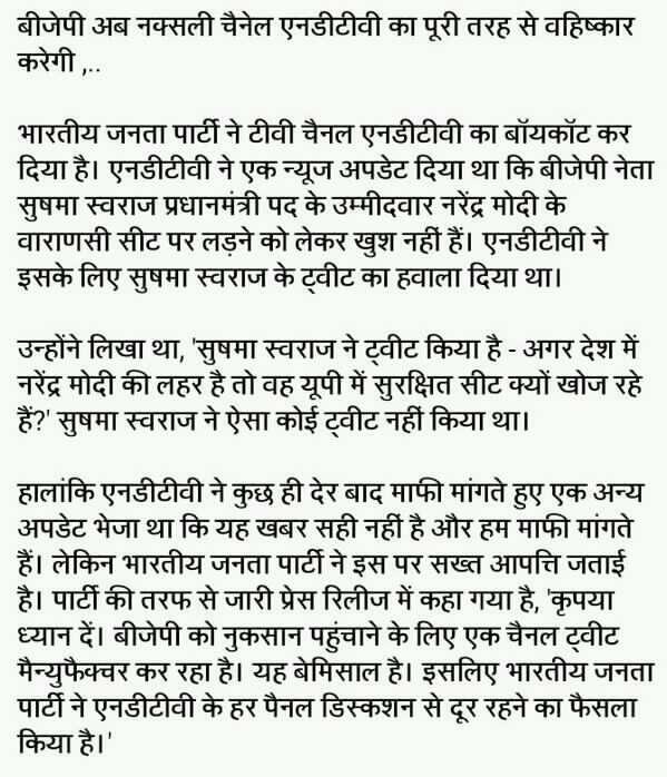 Tweet being manufactured by a channel in order to hurt BJP is unprecedented. BJP therefore has decided to keep away from panel discussions of NDTV for present.